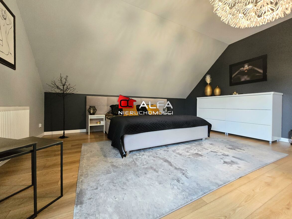 Piętro domu to część prywatna, gdzie jest główna sypialnia z garderobą, dwie sypialnie oraz pokój kąpielowy.